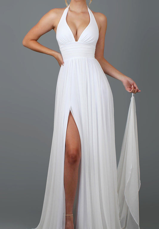 Halter V-Neck Sleeveless Pleated Empire Waist A-Line Beach Wedding Dress