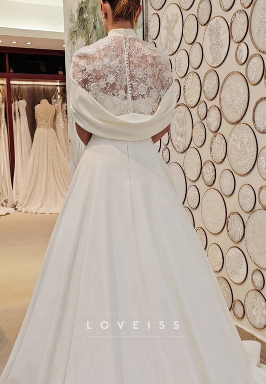 High Neck Cap Sleeves Lace Appliques A-Line Wedding Dress
