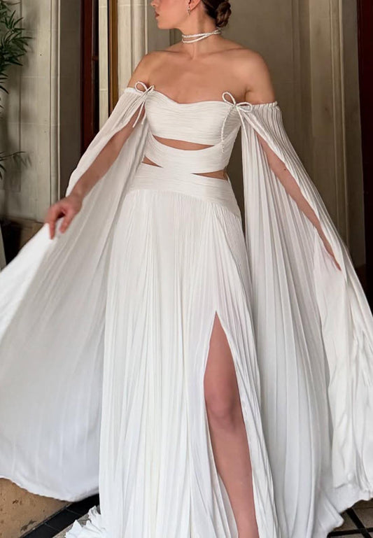 Off-Shoulder Long Sleeves Pleated A-Line Beach Wedding Dress