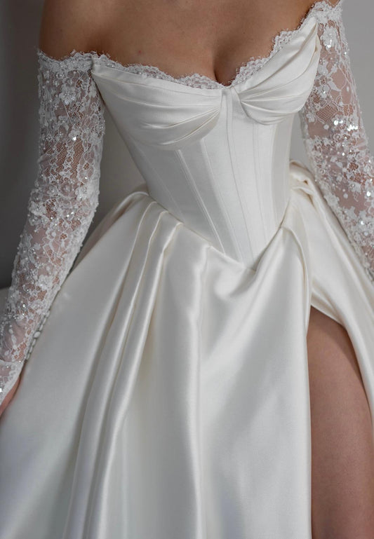 Off-Shoulder Long Sleeves Pleated A-Line Satin Wedding Dress