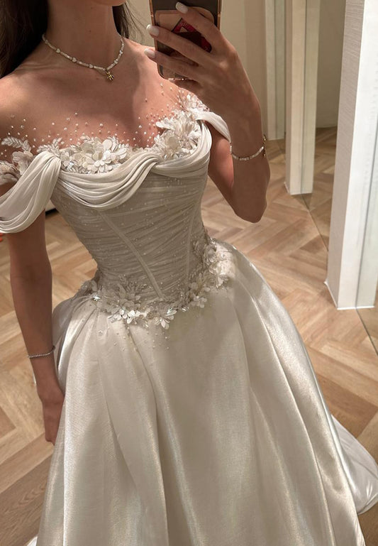 Off-Shoulder Sleeveless Appliques Beaded A-Line Wedding Dress