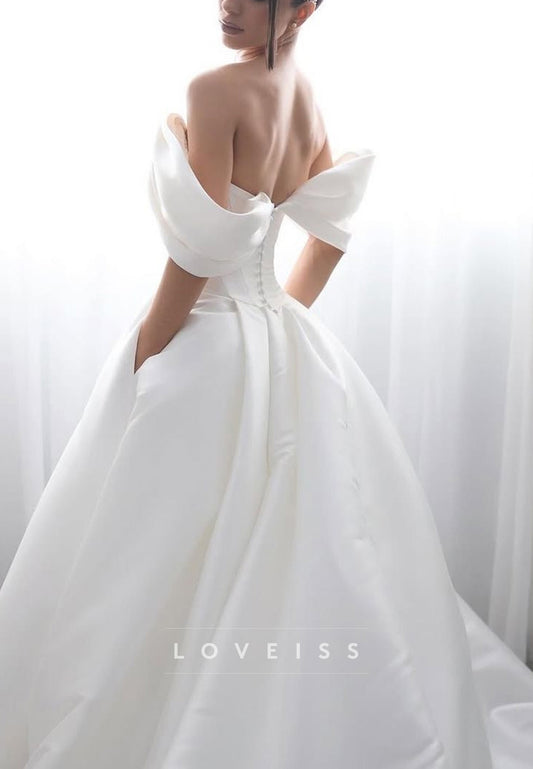 Off-Shoulder Sleeveless Pleated Satin A-Line Weding Dress