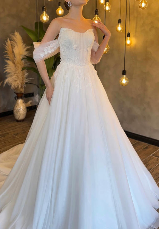 Off-Shoulder Strapless Appliques Pleated Tulle Ball Gown Wedding Dress