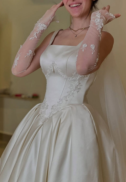 Square Straps Appliques Pleated A-Line Wedding Dress
