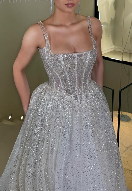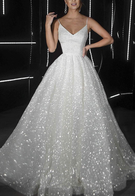 V-Neck Spaghetti Straps Sparkly Ball Gown Wedding Dress