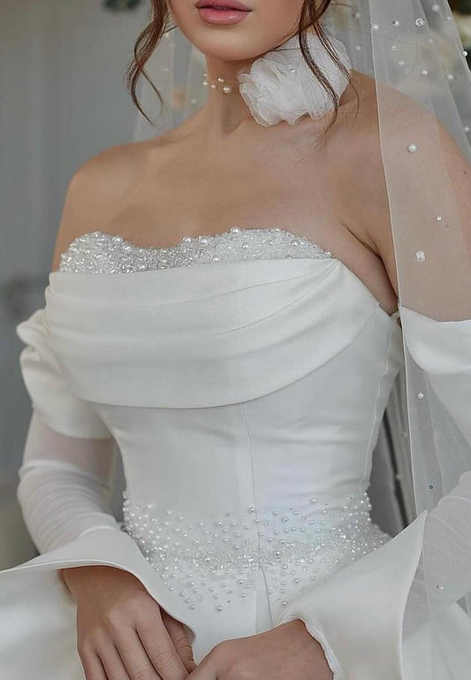 Sweetheart Long Sleeves Beaded Satin A-Line Wedding Dress