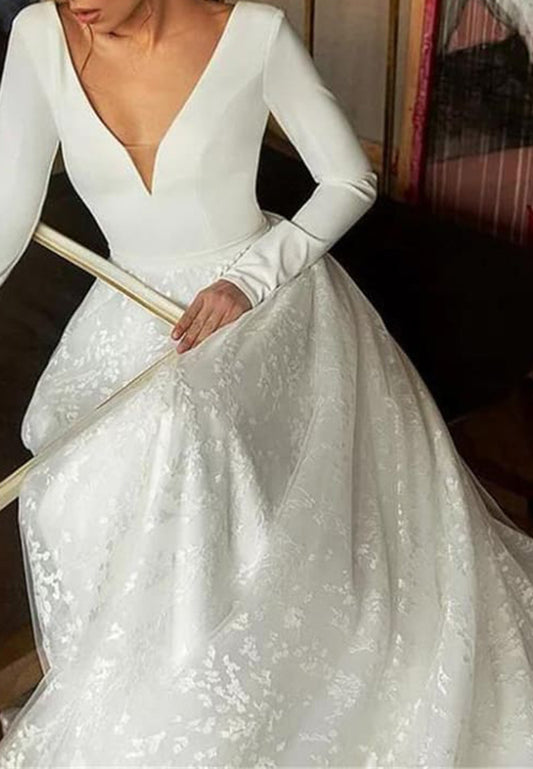 V-Neck Long Sleeves Sparkly A-Line Wedding Dress