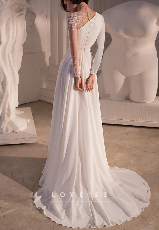 V-Neck Long Sleeves Appliques Chiffon Pleated A-Line Beach Wedding Dress