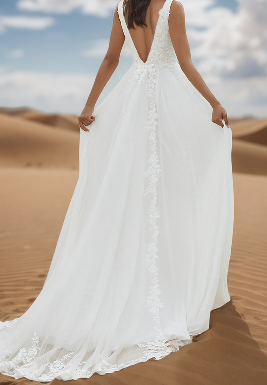 Deep V-Neck Lace Appliques Chiffon A-Line Beach Wedding Dress