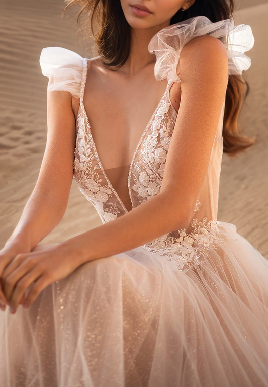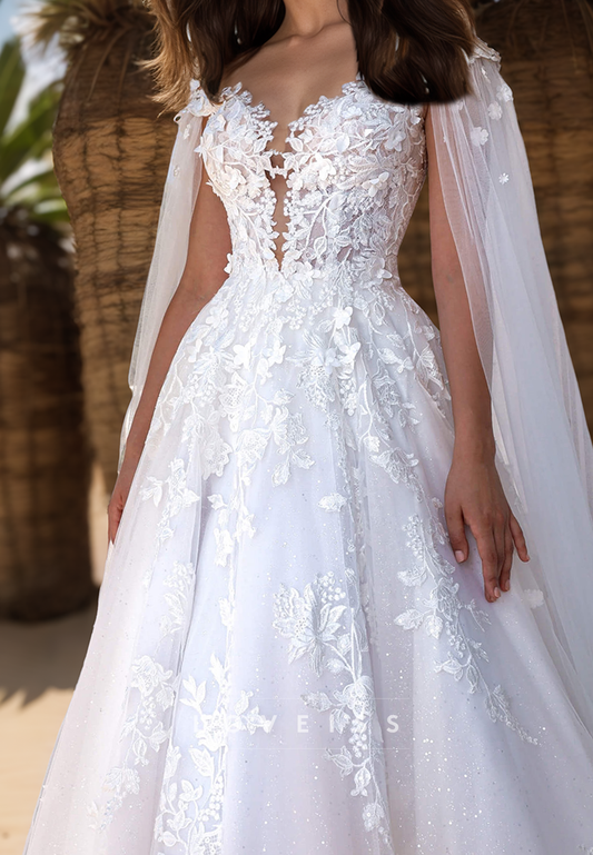 V-Neck Floral Appliques Straps Tulle A-Line Wedding Dress