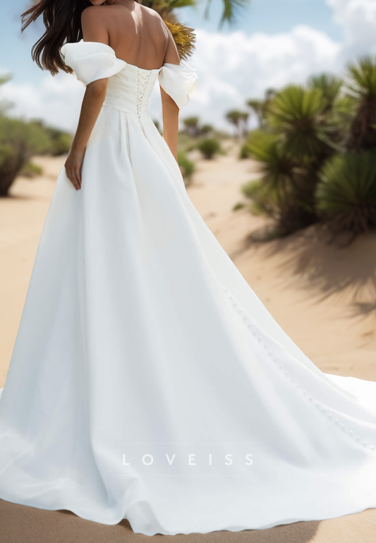Off-Shoulder Side Slit Sleek Satin A-Line Wedding Dress