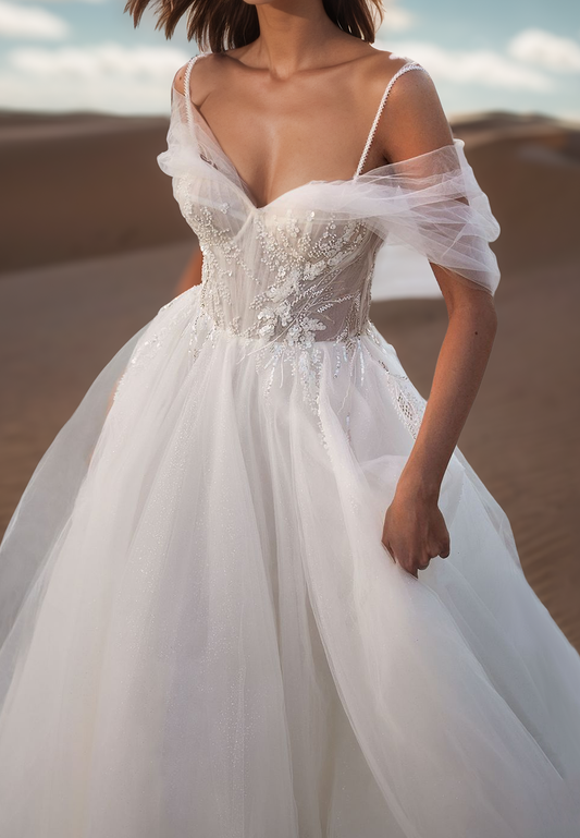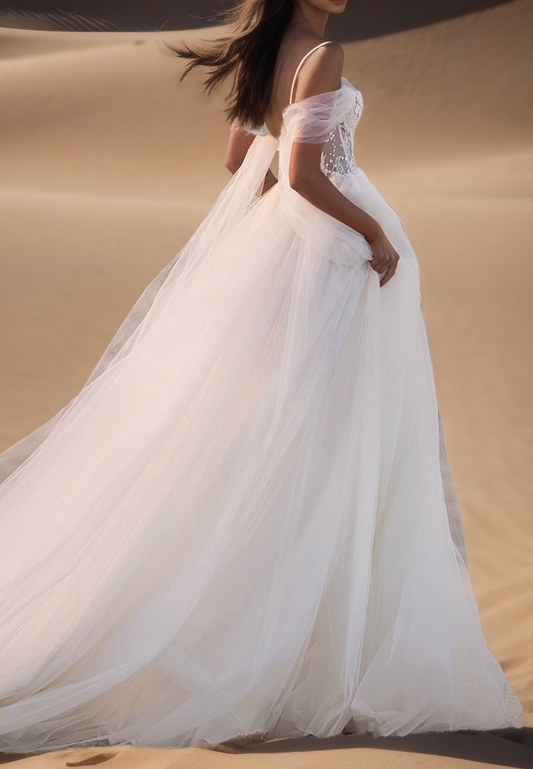 Off-Shoulder Spaghetti Straps Appliques Tulle A-Line Wedding Dress