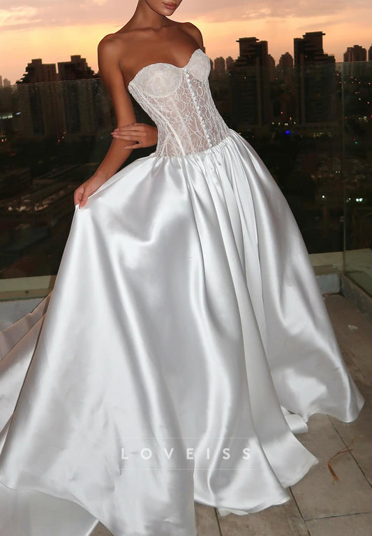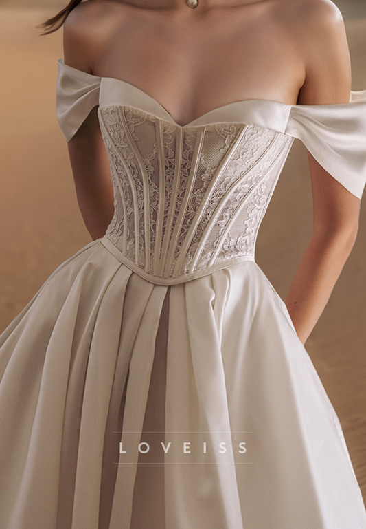 Off-Shoulder Strapless Lace Appliques Pleated Satin A-Line Wedding Dress
