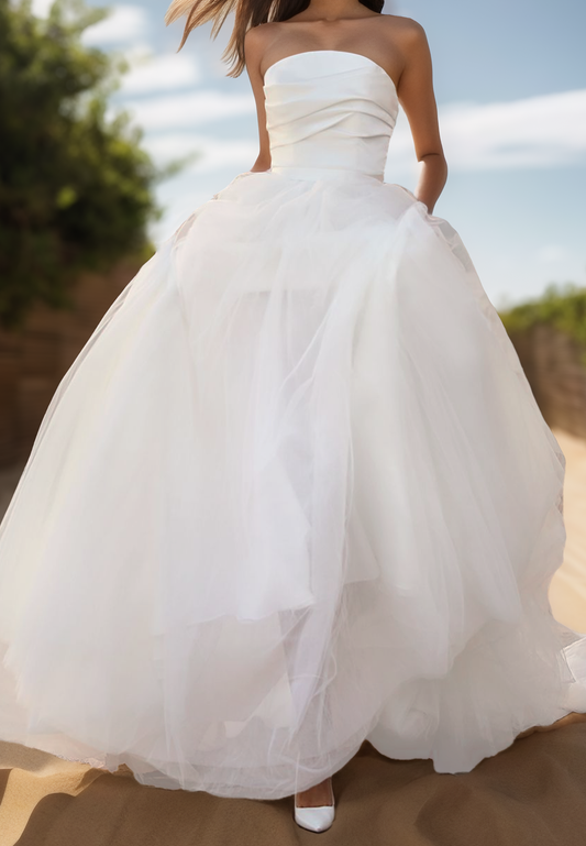 Off-Shoulder Strapless Tulle Pleated A-Line Wedding Dress