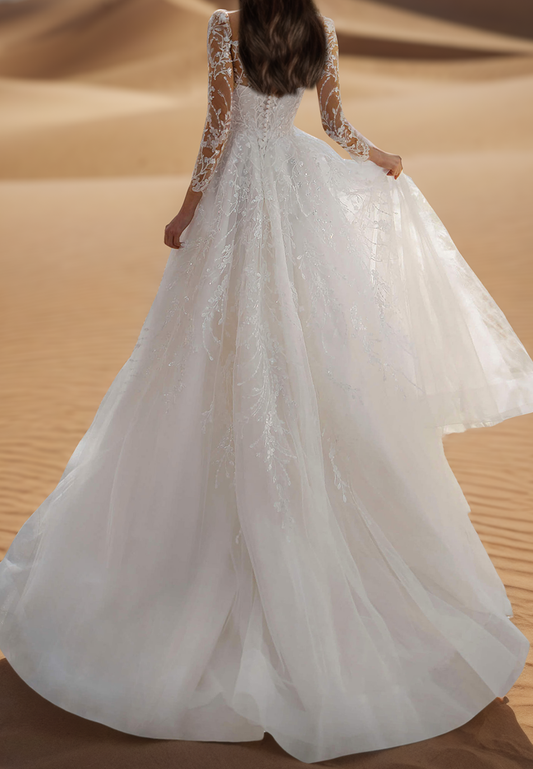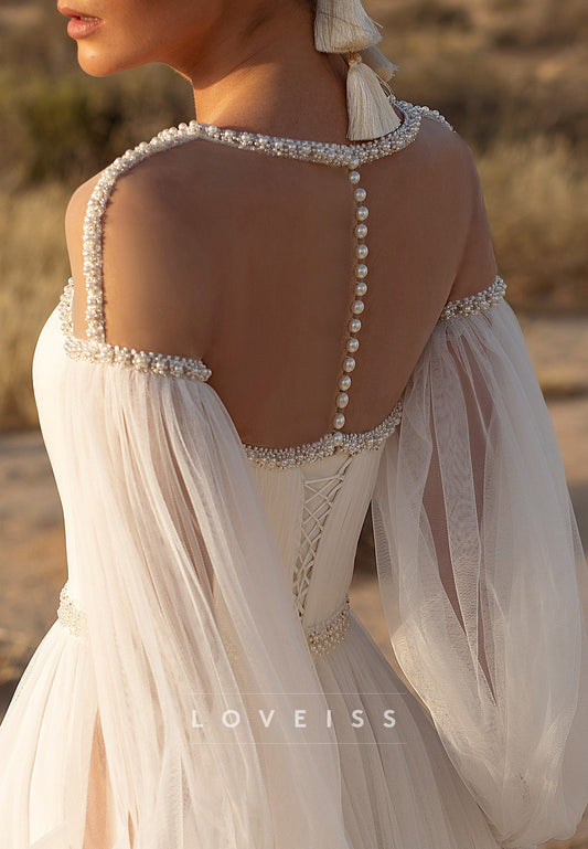 Scoop Long Sleeves Pearl Tulle A-Line Boho Wedding Dress