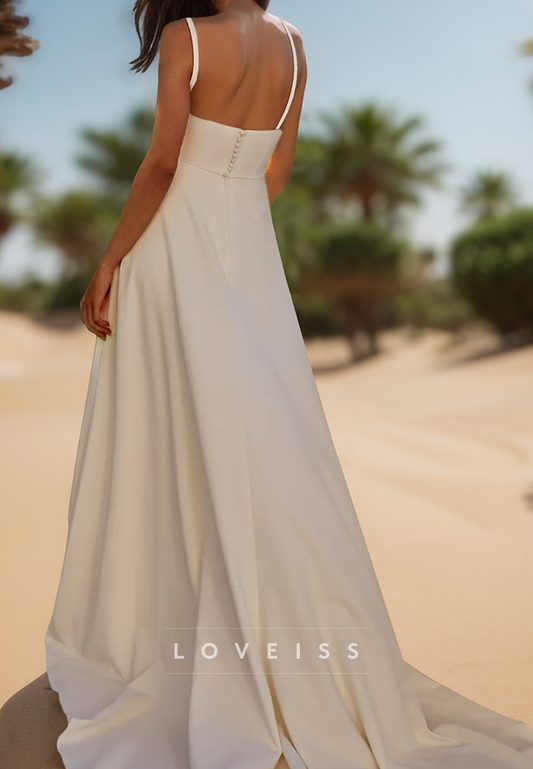 Square Straps Side Slit Sleek Satin A-Line Beach Wedding Dress
