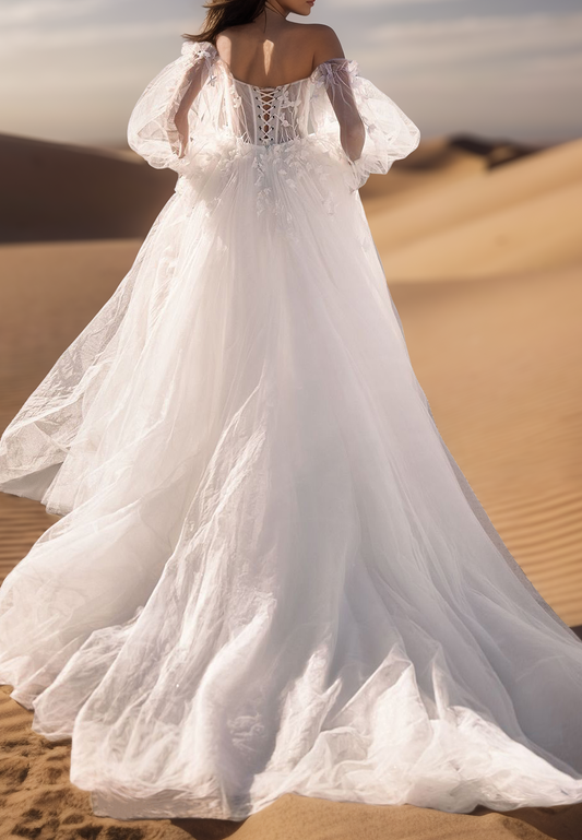 Square Puff SLeeves Appliques Tulle A-Line Wedding Dress