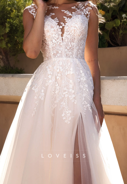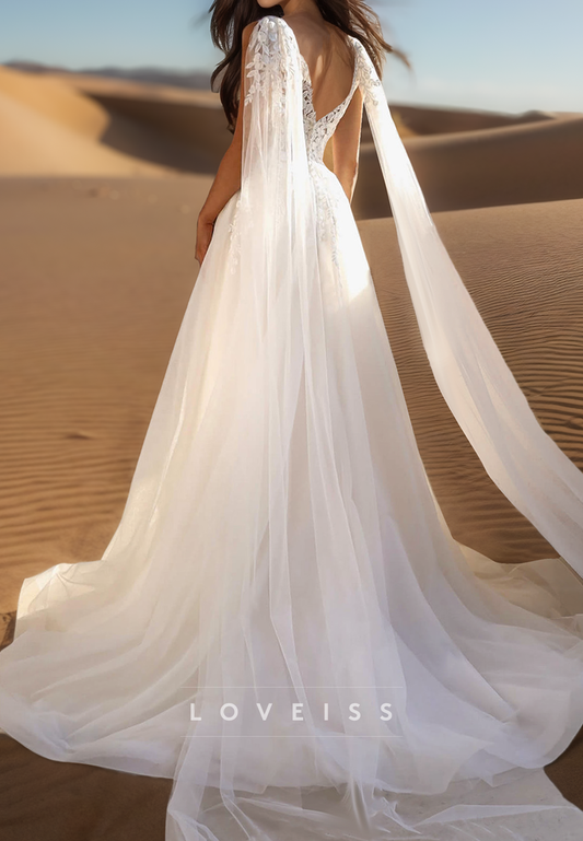 V-Neck Floral Appliques Tulle Side Slit A-Line Wedding Dress