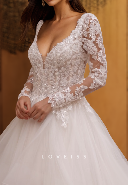 V-Neck Long Sleeves Lace Appliques Ball Gown Wedding Dress