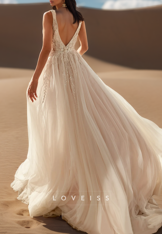V-Neck Sleeveless Floral Appliques Tulle A-Line Wedding Dress