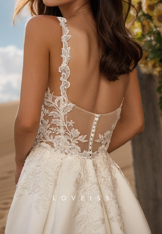 V-Neck Spaghetti Straps Lace Appliques Satin A-Line Wedding Dress