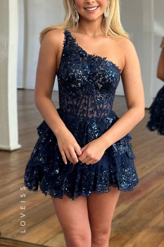 S6016 - Sexy & Luxurious One shoulder Lace Applique Homecoming Party Dress With Sequined