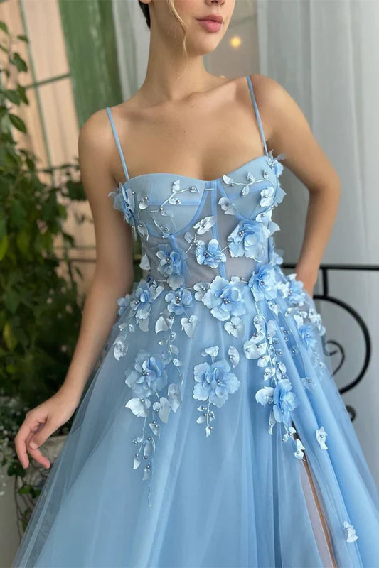 Light Blue Sweetheart Spaghetti Straps 3D Floral A-Line Party Prom Dress