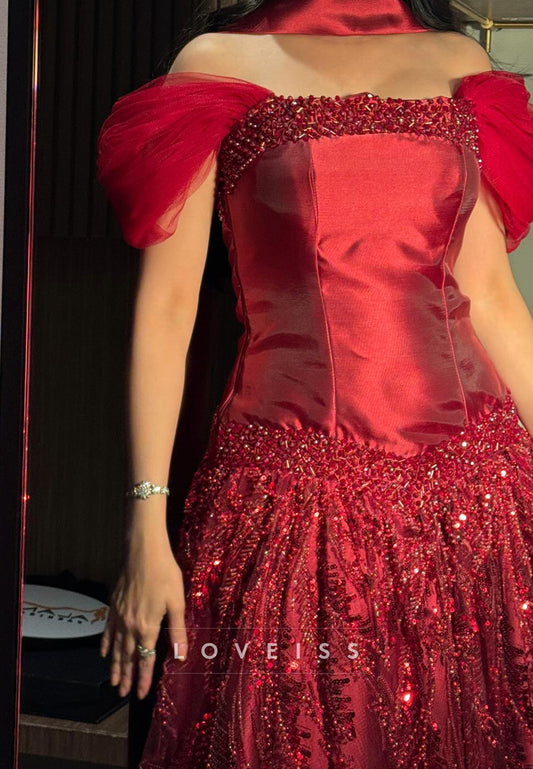 Off-Shoulder Cap Sleeves Sparkly A-Line Prom Dress