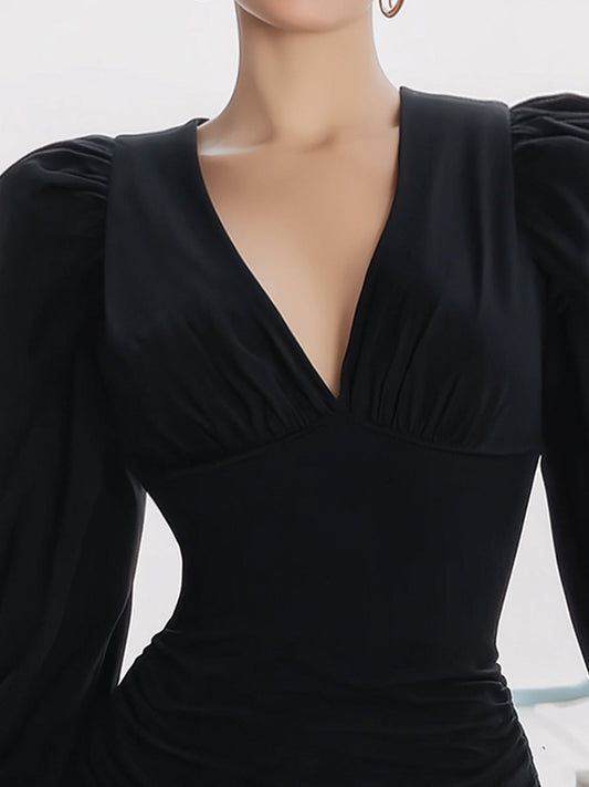 Elegant Black Peplum Midi Dress With Puff Sleeves